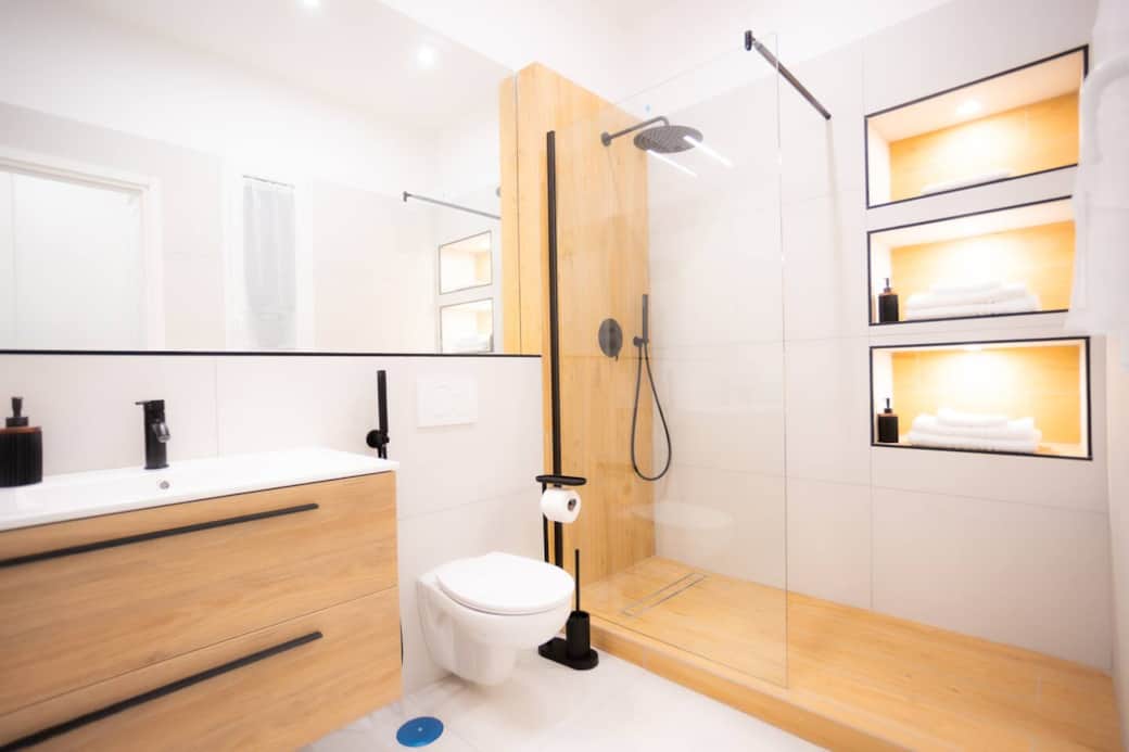 Il bagno della suite è moderno, luminoso e dotato di una doccia ampia con getto regolabile.